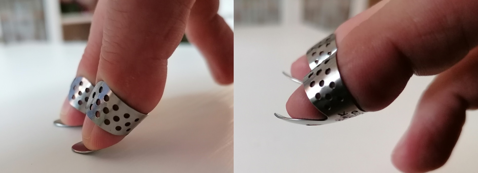 Man kann zwar die Kratzer an den Fingerpicks mit Schleifpapier entfernen und dann die Picks nachpolieren, aber nur bis zu gewissen Grenzen verschwinden die Kratzer. Tiefere Kratzer kann man nicht ganz wegschaffen, egal wie lange man poliert. Billige Fingerpicks kann man wegwerfen und neue kaufen, aber diese Picks, die schon pro Stück über 20 Euro gekostet haben, ist schon schade wegen Kratzern wegzuwerfen. Bewahre die Fingerpicks am besten dort auf, wo nichts Scharfes sie zerkratzen könnte.
