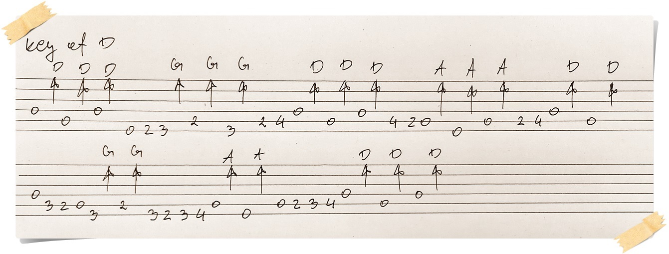geh rechts von Akkord G , so hast du die Noten A B C D. Bei letzte Note D - zupfst du einmal die Note D und spielst Akkord D mit Schlagmuster. Wenn du jetzt zurück von D auf Akkord G gehen willst, spielst du gleiche Noten aber rückwärts, nämlich C B A und letztlich Akkord G